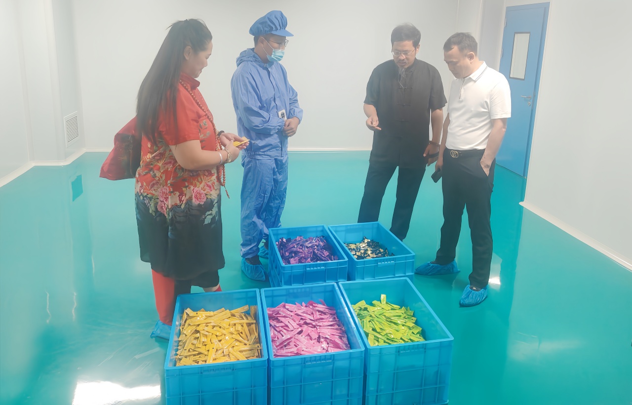 随后,在郑军董事长的带领下,周绍群一行重点考察了公司的无尘无菌生产车间。进入车间前,考察团成员严格遵循车间管理规范,经过更衣、洗手、消毒、风淋等多道程序,确保符合无菌生产要求。走进车间内部,整洁有序的生产环境令人印象深刻:全封闭的生产流水线平稳运转,不锈钢生产设备锃亮洁净,空气中弥漫着淡淡的草本清香。车间内,工作人员身着统一的无菌服、手套和口罩,正有条不紊地进行原料处理、熬制提取、精准分装等操作。