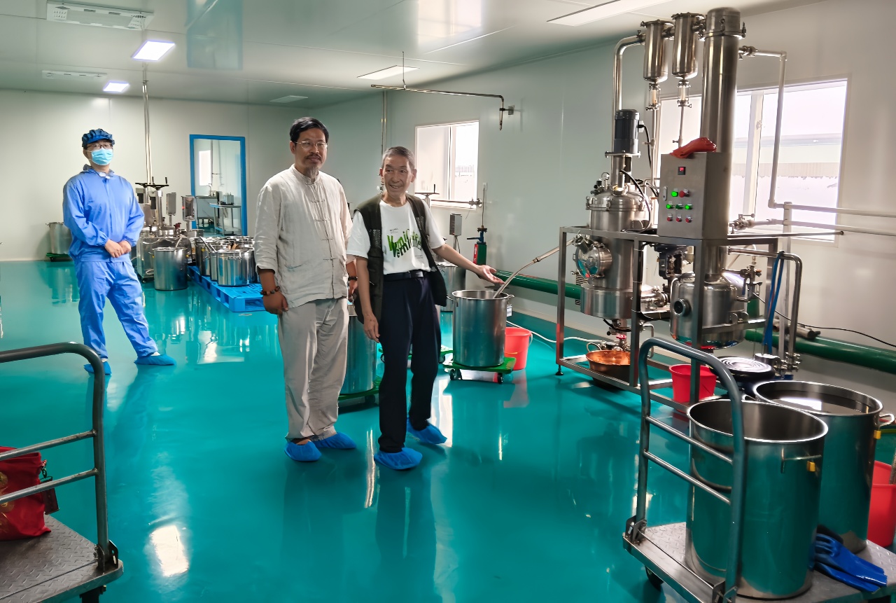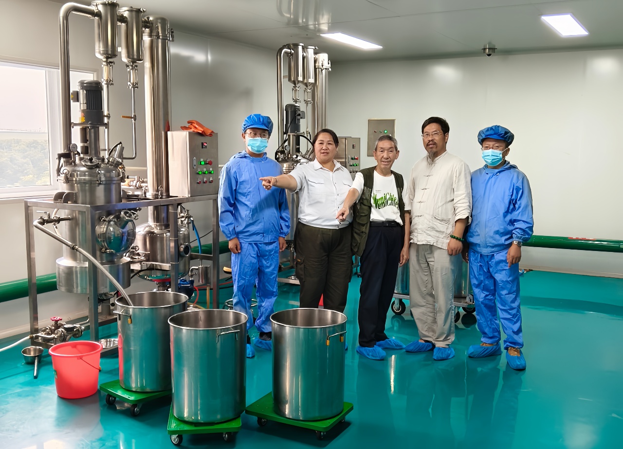 随后,在郑军董事长的带领下,周绍群一行重点考察了公司的无尘无菌生产车间。进入车间前,考察团成员严格遵循车间管理规范,经过更衣、洗手、消毒、风淋等多道程序,确保符合无菌生产要求。走进车间内部,整洁有序的生产环境令人印象深刻:全封闭的生产流水线平稳运转,不锈钢生产设备锃亮洁净,空气中弥漫着淡淡的草本清香。车间内,工作人员身着统一的无菌服、手套和口罩,正有条不紊地进行原料处理、熬制提取、精准分装等操作。
